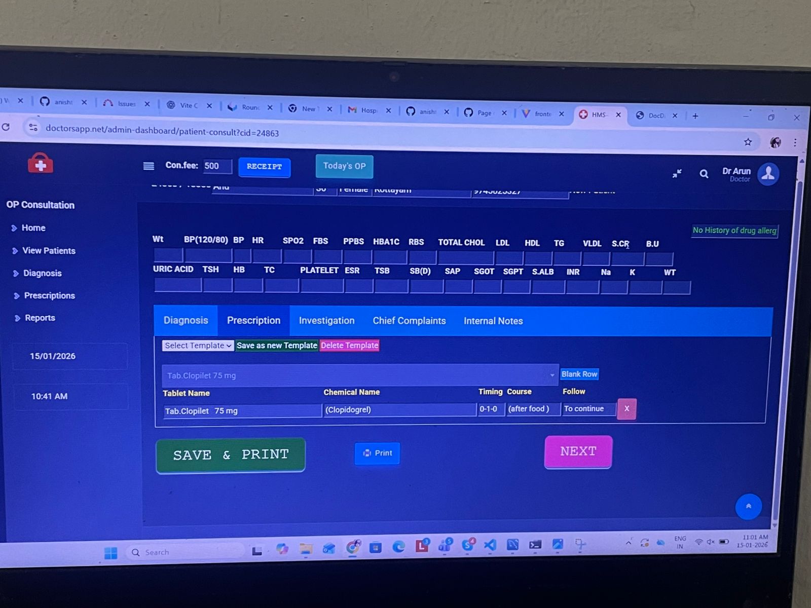 Doctor Login → Today Queue → Open Token → Consultation Page
