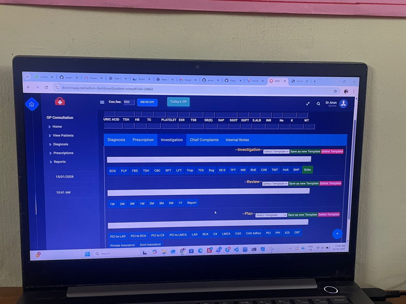 Implement the medical details section inside the Doctor Consultation Page, covering Chief Complaints, Diagnosis, Investigation, and Prescription.
